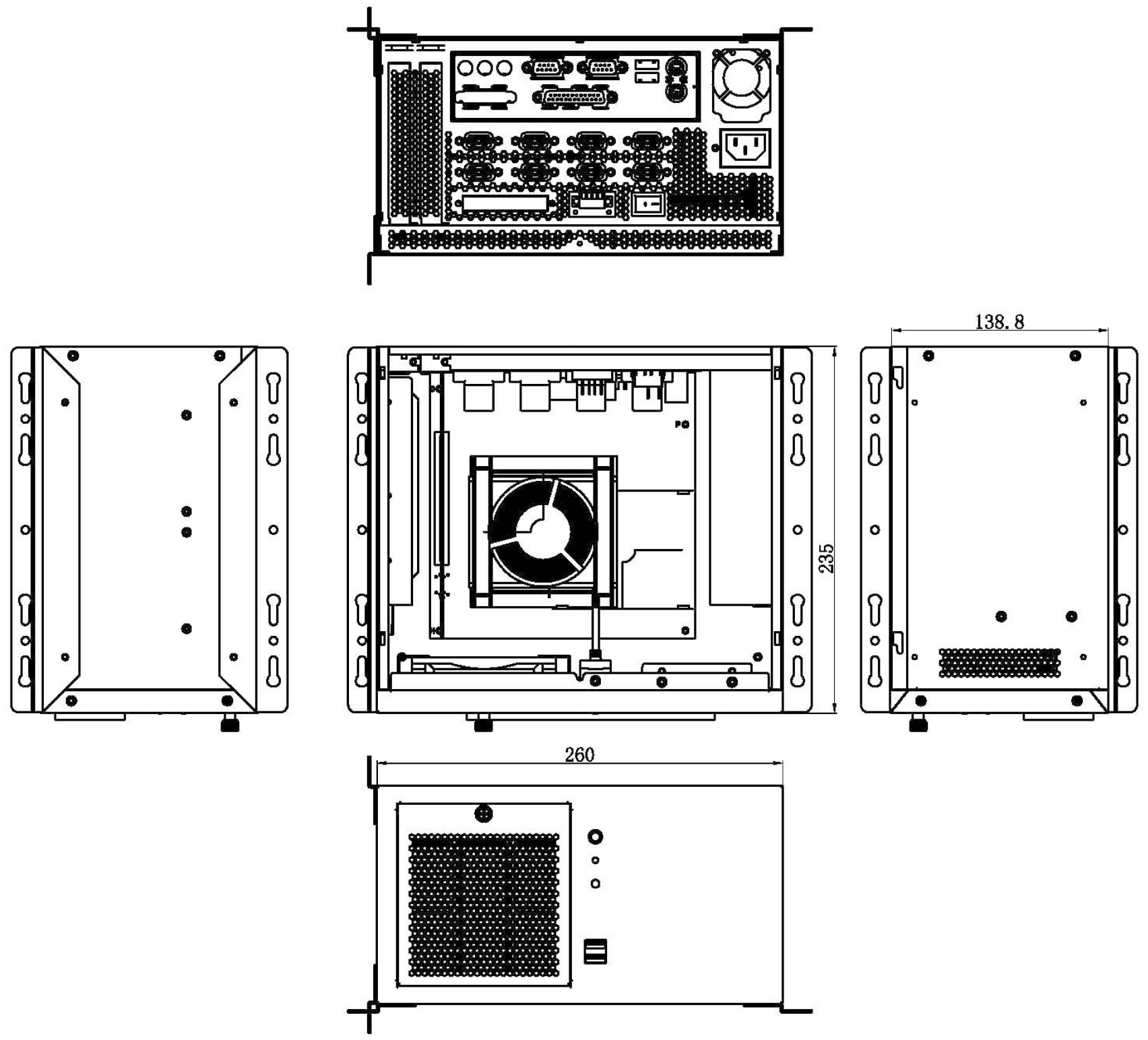 拓普龍TP2142壁掛式工控機箱采用1.0mmSGCC優質板材生產而成,機箱尺寸為235mm(L)*260mm(W)*140mm(H),支持6.7"*6.7"(Mini-ITX)主板,支持1個3.5" 硬盤位,兼容2個2.5" 硬盤,標配1個9025風扇,后板和兩側面設計有高密度散熱孔,具有優良的散熱效果,機箱支持Flex 1U電源,支持2個全高PCI/PC