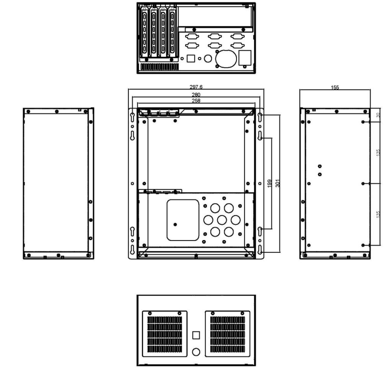 拓普龍IPC6204壁掛式工控機箱采用1.0mmSGCC優質板材生產而成,機箱尺寸為330mm(L)*260mm(W)*155mm(H),支持9.6"*9.6"(Micro-ATX)及以下尺寸的主板,支持1個3.5" 硬盤位,兼容2.5" 硬盤,標配2個8025S風扇,具有優良的散熱效果,機箱支持Flex 1U電源,支持4個全高PCI/PCIE擴展槽位,后面
