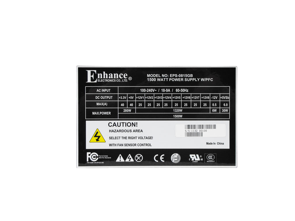 組件名稱規格尺寸150mm(W) 86mm(H) 220mm(L)交流輸入100-240V /18-9A /60-50HZ直流輸出+3.3V+5V+12V1+12V2+12V3+12V4+12V5+12V6+12V7+12V8-12V+5VSB40A40A25A25A25A25A25A25A25A25A0.5A6.0A額定功率280W1320W6W30W總功率1500WPFC規格帶主動式功率因