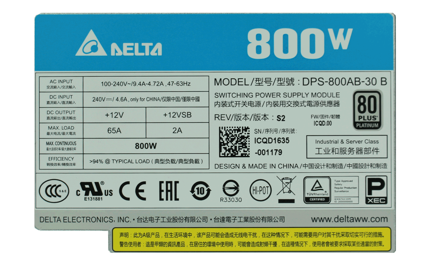 組件名稱規格尺寸(mm)深240mm*寬77mm*高85mm額定功率800W型號AC-148A交流輸入100~240V~. 48A-4A直流輸出+3.3V==16A,+5V==22A,12V1==48A,-12V==0.5A,+5VSB==4A+12V combined current max 48A/58A接口24PIN*1,方8PIN*2,大4PIN*10,SATA*2安規CE 3C EA