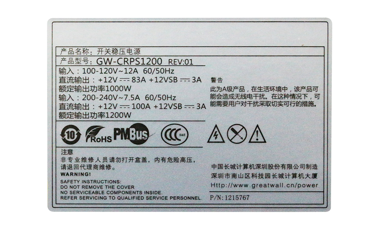 | 200-240V/7.5A/50-60HZ | 直流輸出:12V/100A,+12VSB/3A | 額定輸出功率:1200W | |