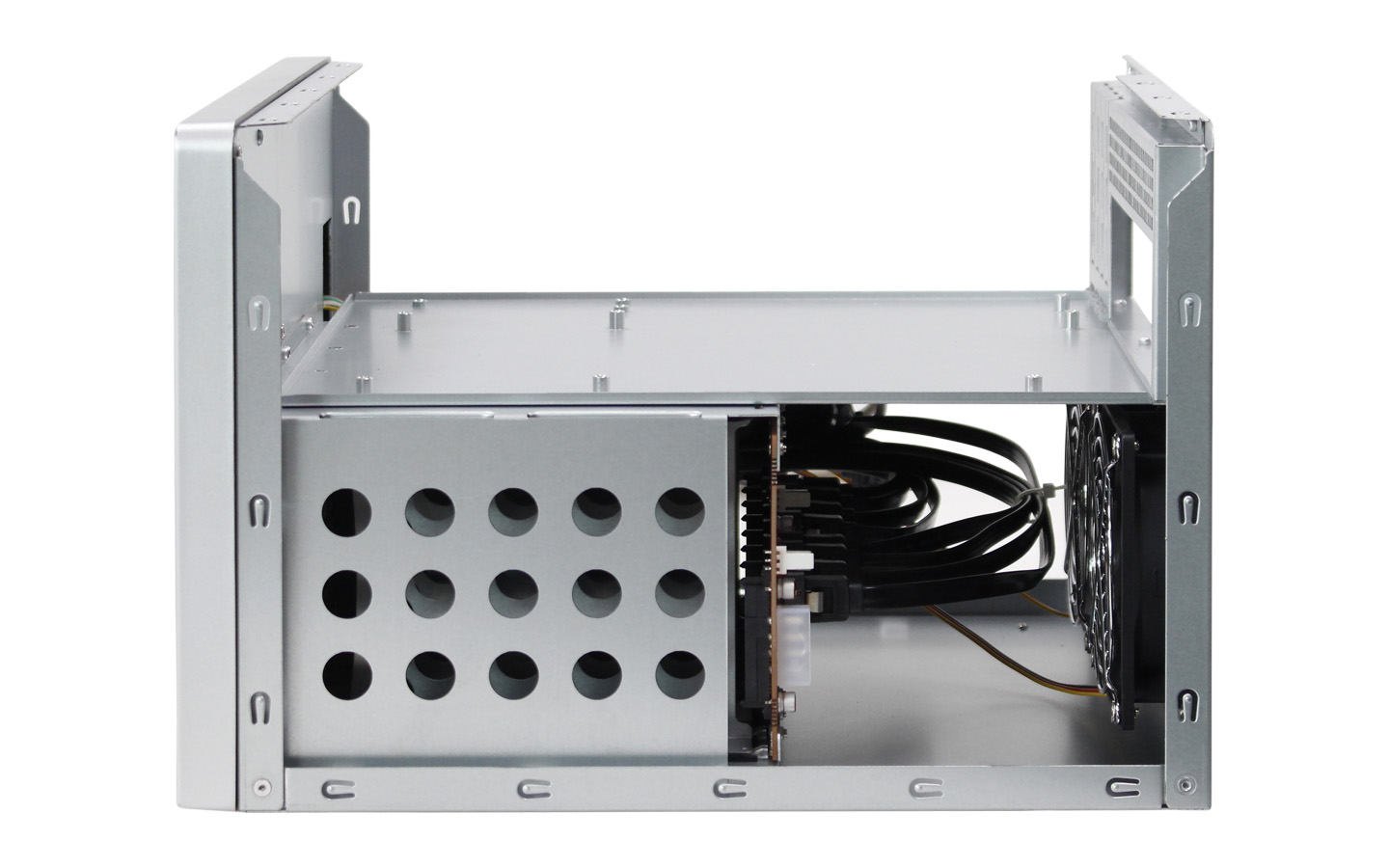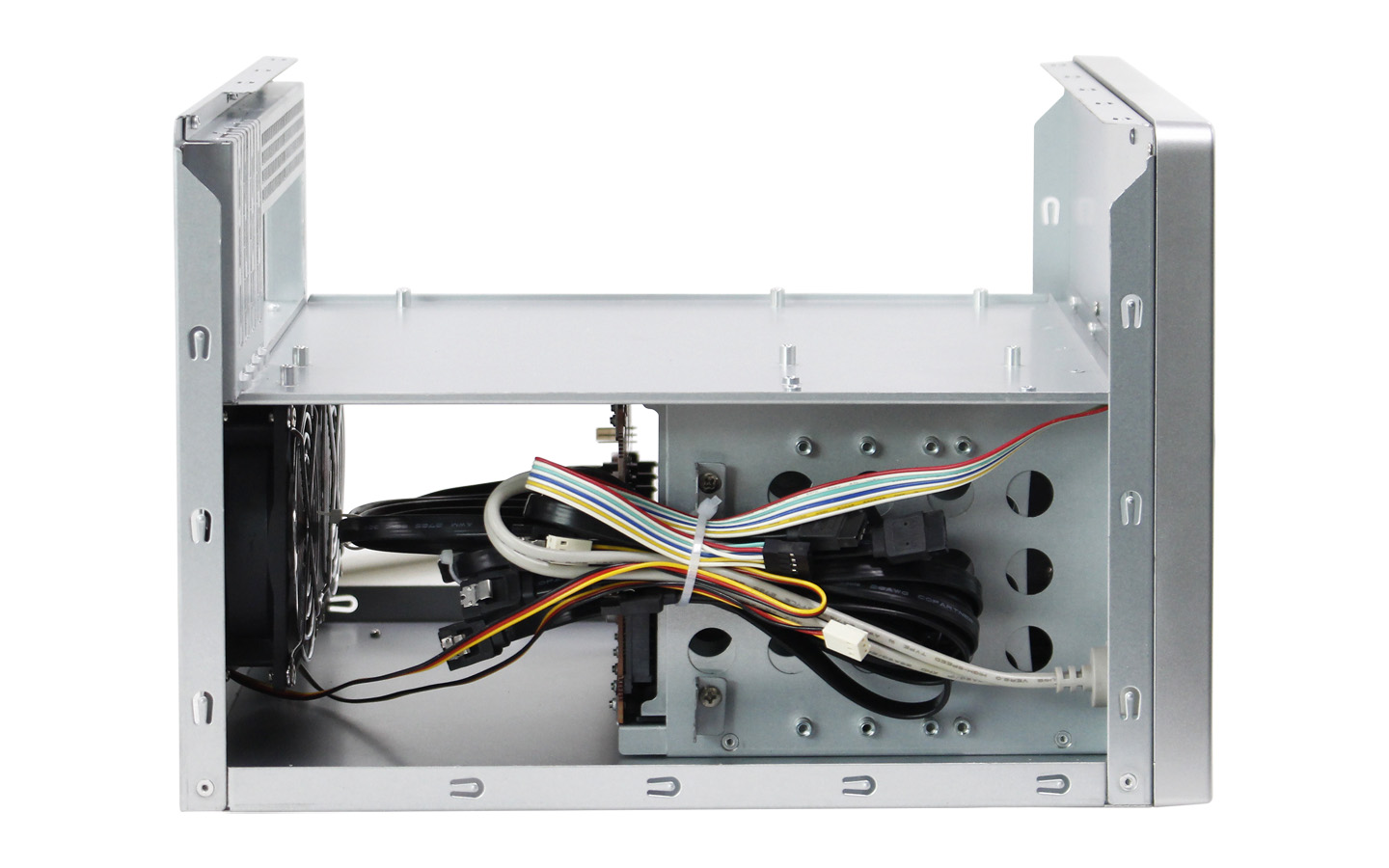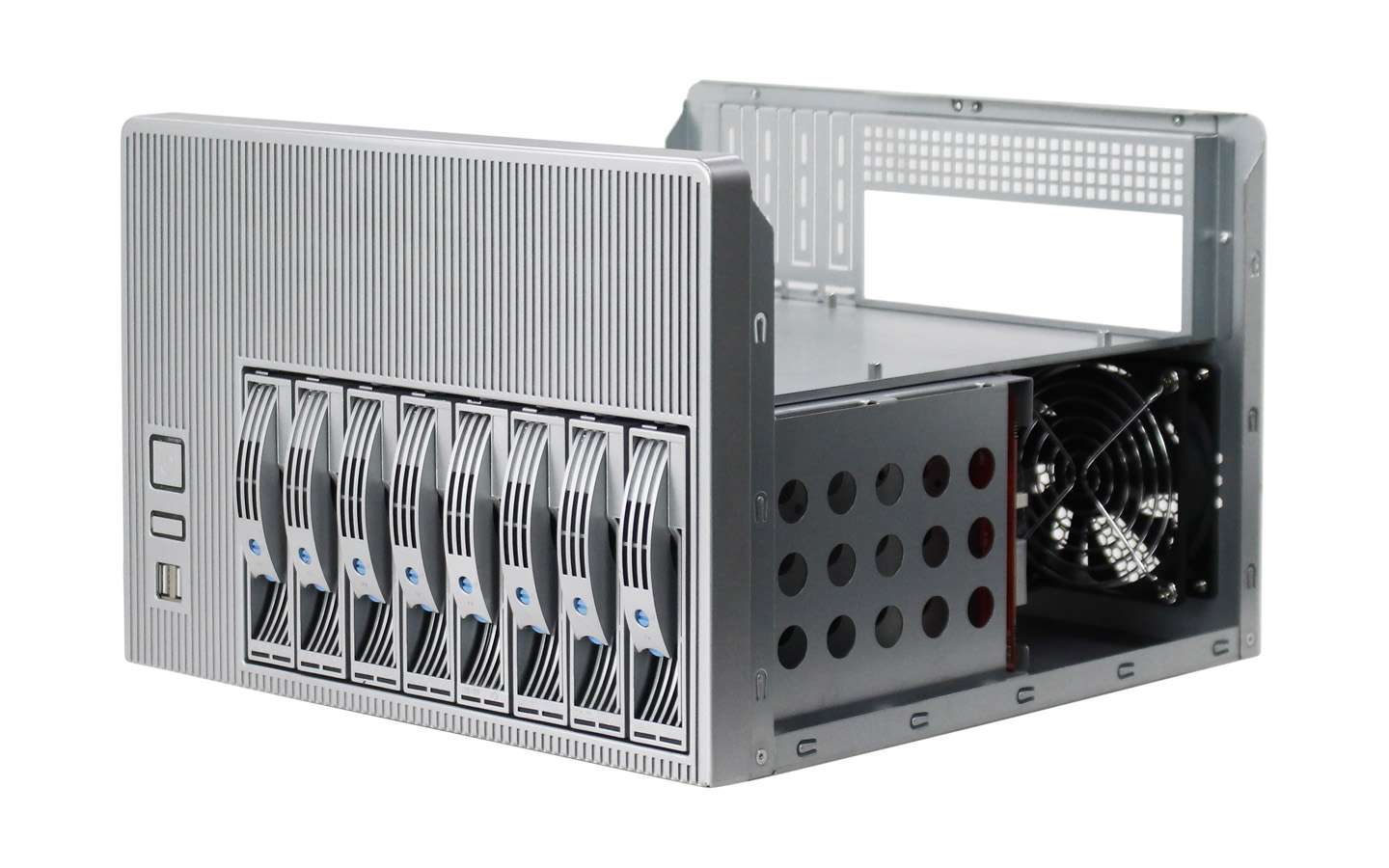 本款NAS-08家用存儲機箱外表面采用水轉印工藝,搭配高檔時尚的青花瓷顏色,經典雅致而不失科技感,機箱可安裝Micro-ATX/Mini-ITX主板,標準1U電源和Flex小1U電源,支持8個3.5"熱插拔硬盤位,同時兼容2.5" SSD,標配2個9025S風扇和1個6025S風扇,具有良好的散熱效果。