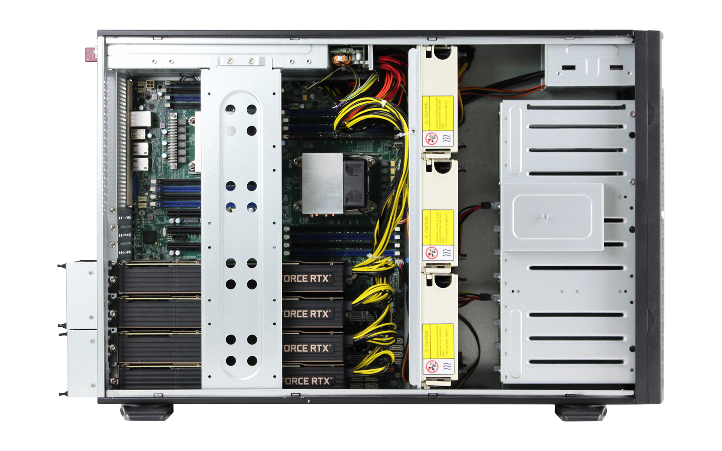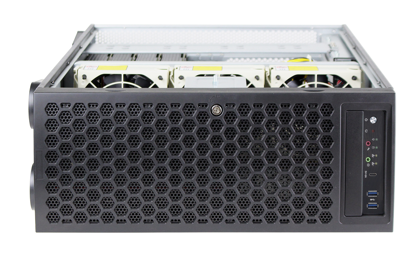 拓普龍8049ETX-4塔式服務器機箱支持機架式安裝和立式安裝,支持4個前置SATA/SAS/NVME熱插拔硬盤(NVME功能為選配),內置4個3.5英寸硬盤位,支持15.2"*13.2"及以下尺寸的主板(超微X10DRG-Q/X11DPG-QT/X12DPG-QT6/泰安S7106等等),兼容CRPS冗余電源模塊+電源板,支持11個PCIE全高擴展槽位,可安裝4張雙寬GPU,支持主流Nvidia 3080/3090/4080/4090 GPU,標配3個12038和2個8038滾珠風扇,前門板采用高密度進風孔,具有良好的散熱風道,廣泛應用于AI大模型訓練,深度學習,渲染,云計算等領域。