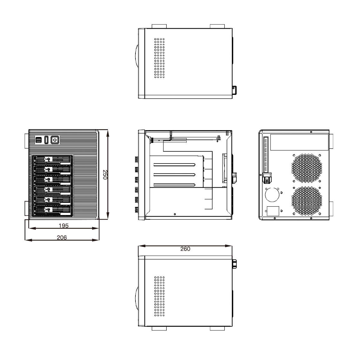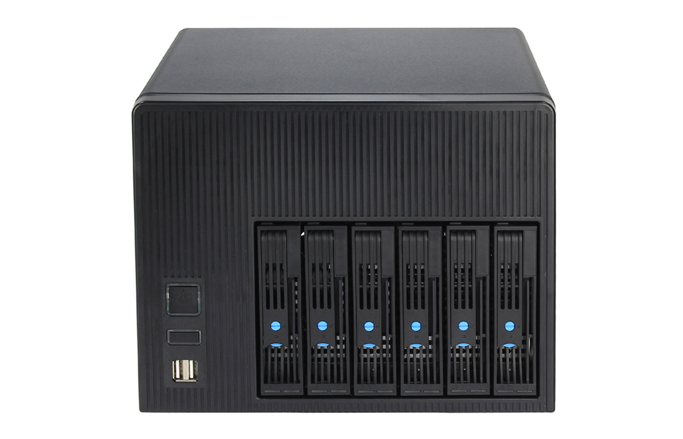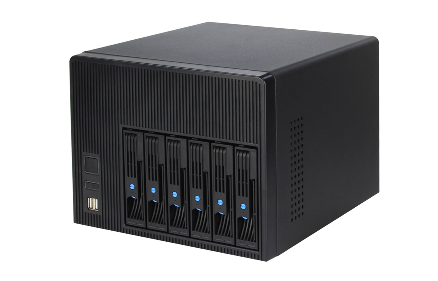 本款NAS-06機箱可安裝Mini-ITX(170mm*170mm)主板,安裝Flex小1U電源,支持6個3.5"熱插拔硬盤位,同時兼容2.5" SSD,標配2個8025風扇,具有良好的散熱效果,支持1個全高PCIE擴展槽。
