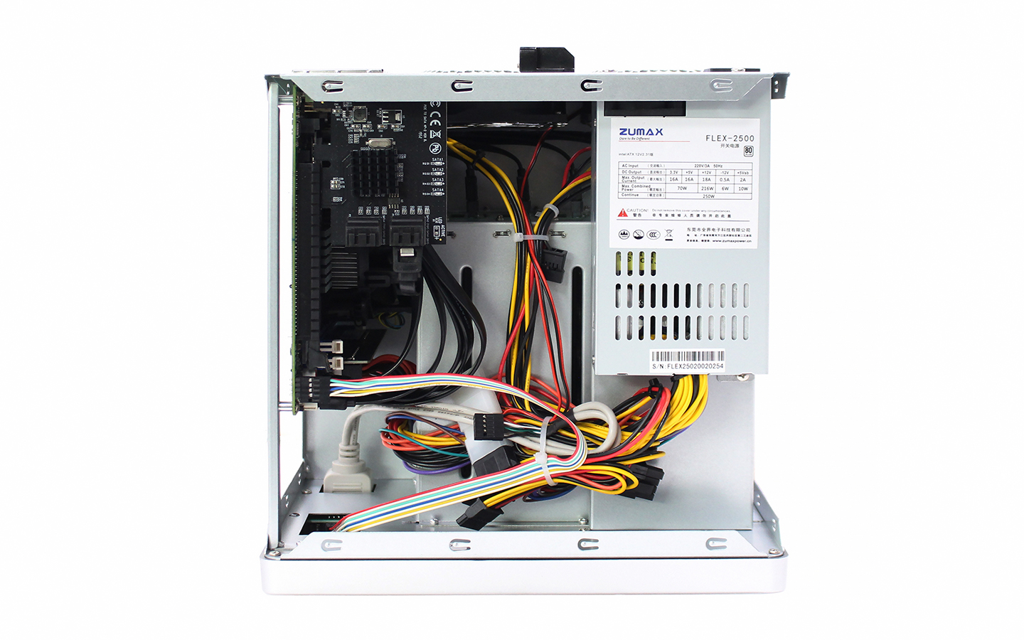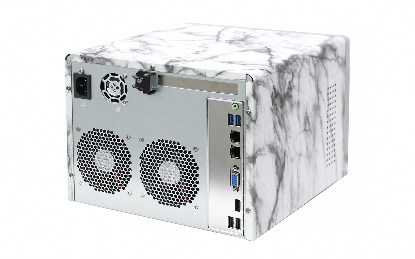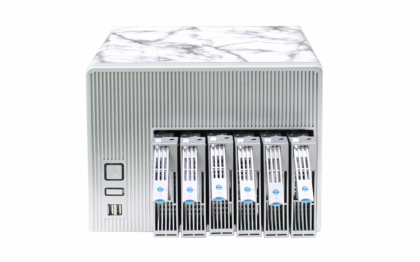 本款NAS-06機箱外表面采用水轉印工藝,搭配經典的大理石顏色,高冷而不失科技感,機箱可安裝Mini-ITX(170mm*170mm)主板,安裝FLEX小1U電源,支持6個3.5"熱插拔硬盤位,同時兼容2.5" SSD,標配2個8025風扇,具有良好的散熱效果。